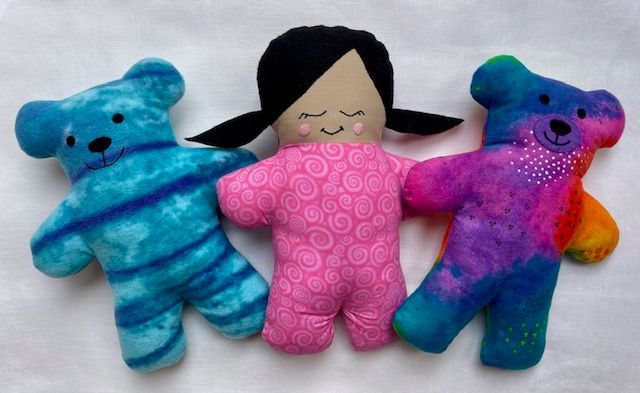 Bears should be made of soft fabrics such as fleece, minky, and flannel, while dolls may also be made of quilting cotton with fleece or felt hair. Detailed instructions and printable patterns are available at