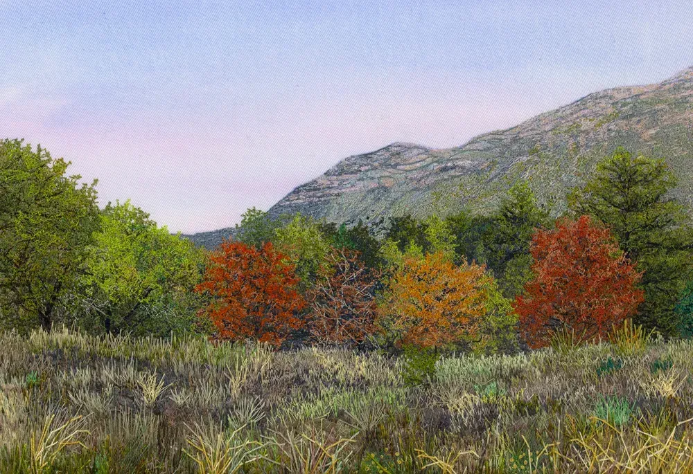 In this new program, Thread Painting Landscapes, we saw highlights from her latest series and learned the many fiber-art techniques that Shewmaker uses to infuse her landscapes with a painterly aesthetic. Based on the autumn foliage in Buffalo National River and Devil’s Den State Park, her new works are created using free-motion machine-embroidery, which enables her to achieve organic textures and stunning color gradations.