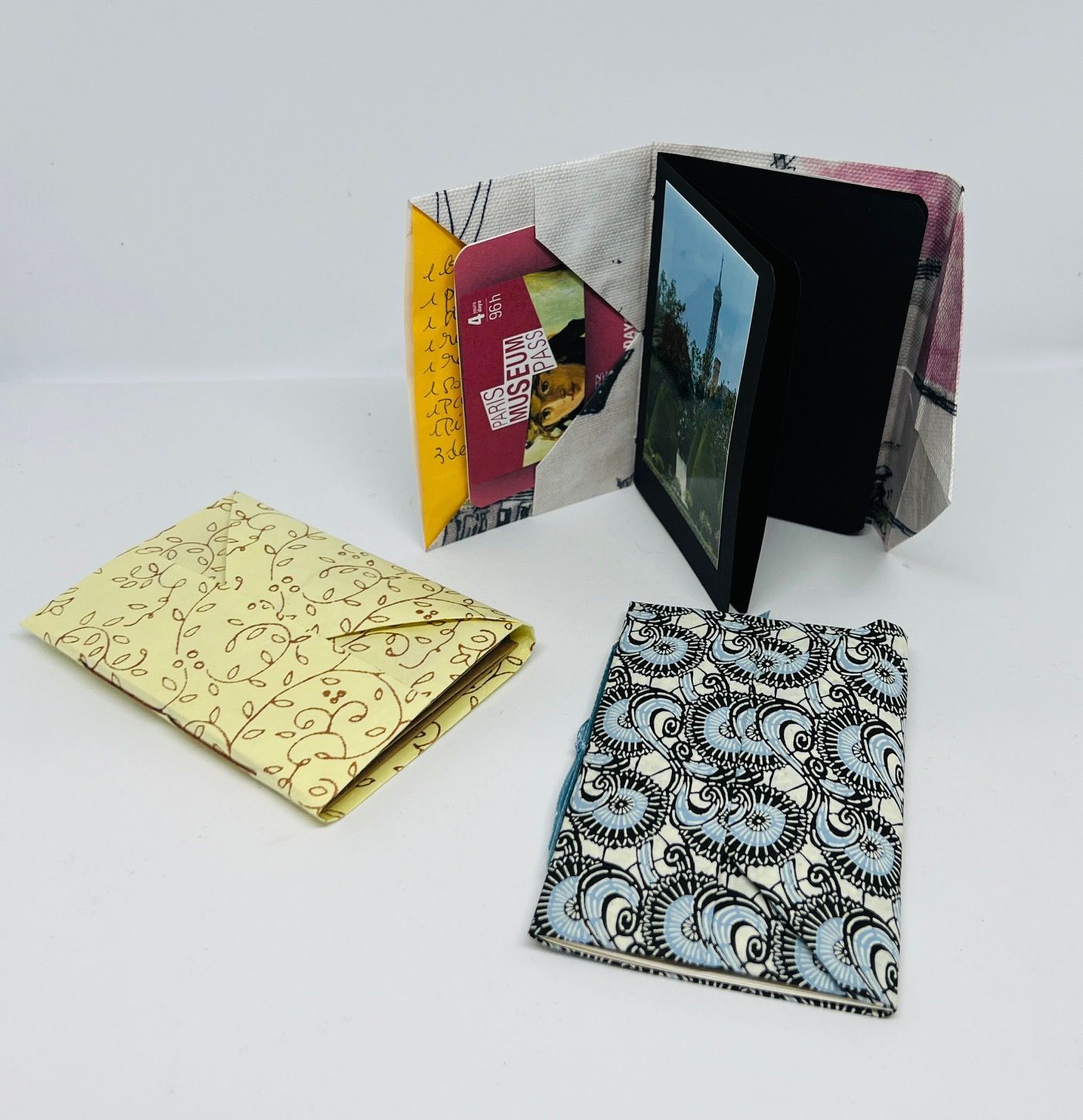 In this workshop, you'll learn to fold a diagonal pocket and sew in pages. The outer cover can hold artist trading cards (ATCs), gift cards, or affirmation cards; the pages can be a journal or be fashioned as folded pockets to hold more cards. This workshop is inspired by Hedi Kyle’s “Art of the Fold” book.